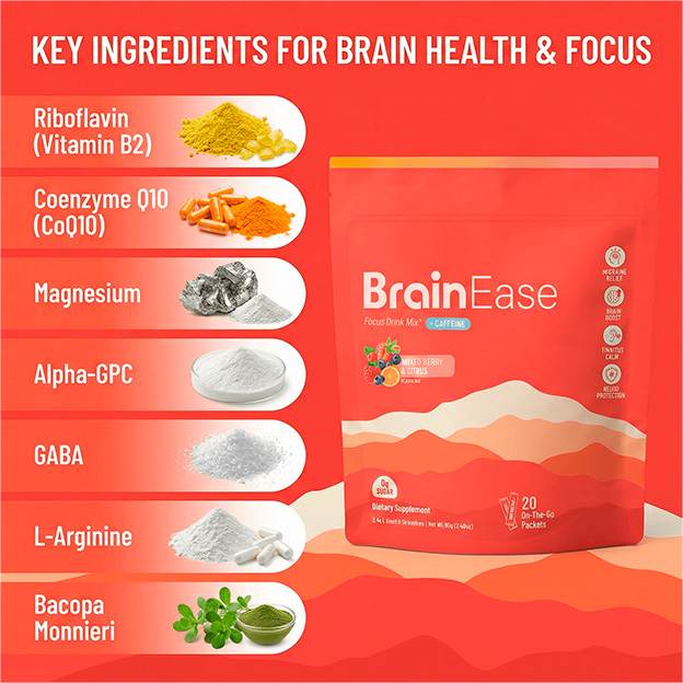 BrainEase uses a scientifically supported blend of natural ingredients to support neural repair and function without relying on stimulants like caffeine. Its formula may target pathways involved in migraine prevention, memory enhancement, and auditory nerve support, but you should always compare ingredients and research when choosing a supplement.