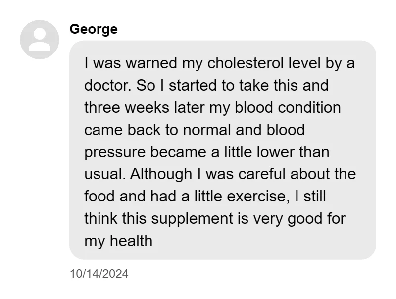 "I have just ordered my 2nd batch. I am due heart surgery in the coming weeks and my surgeon is happy with my blood flow and cholesterol"